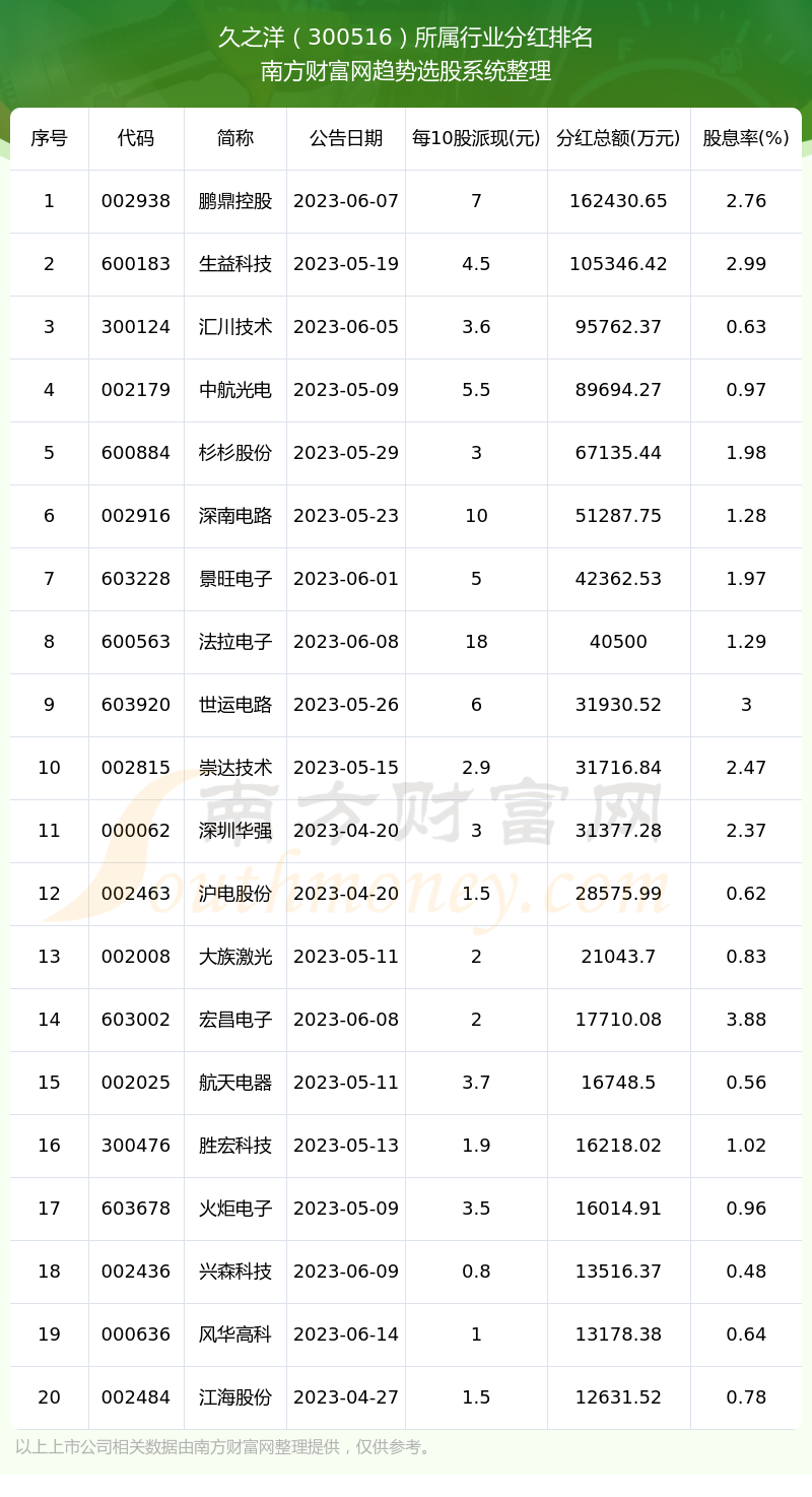 按照趋势选股系统统计,久之洋所属行业为电子元件行业,电子元件行业分红排名情况如下表: