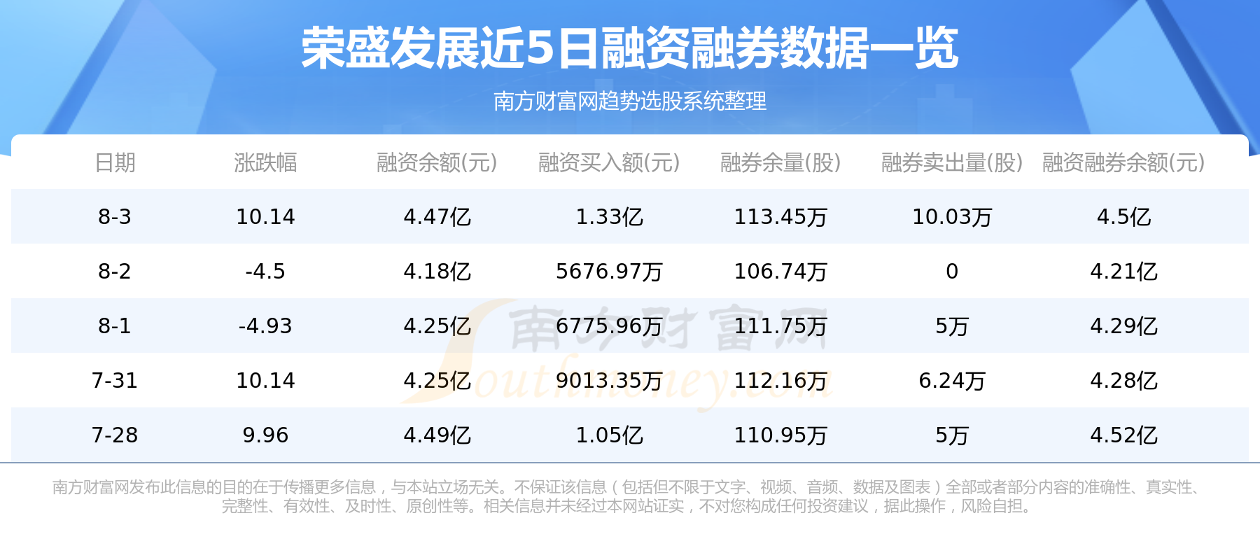 8月3日荣盛发展融券信息显示,融资方面,当日融资买入1.33亿元,融资偿还1.05亿元,融资净买额2879.91万元。融券方面,融券卖出10.03万股,融券偿还3.32万股,融券余量113.45万股,融券余额344.88万元。融资融券余额4.5亿元。近5日融资融券数据一览见下表: