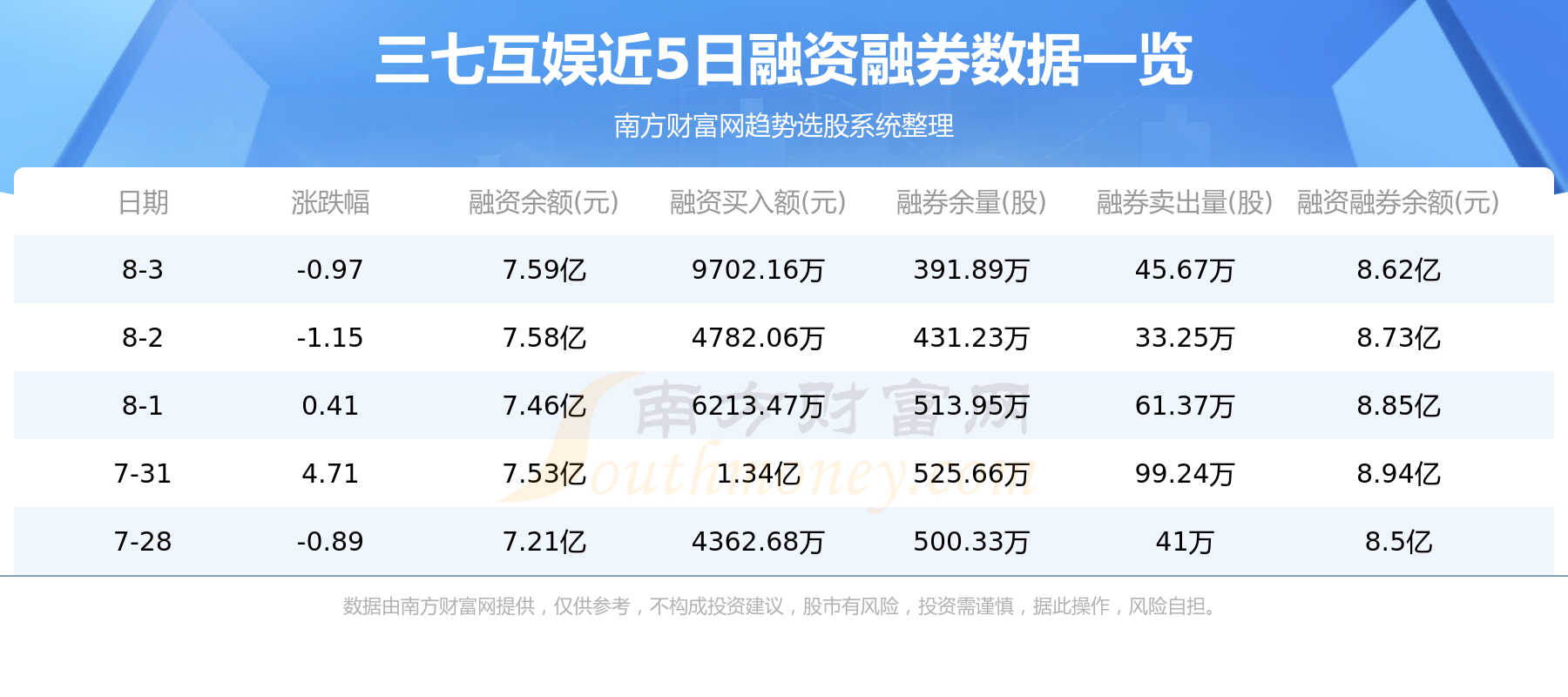 三七互娱8月3日融券信息显示,融资方面,当日融资买入9702.16万元,融资偿还9678.43万元,融资净买额23.73万元。融券方面,融券卖出45.67万股,融券偿还85.01万股,融券余量391.89万股,融券余额1.04亿元。融资融券余额8.62亿元。