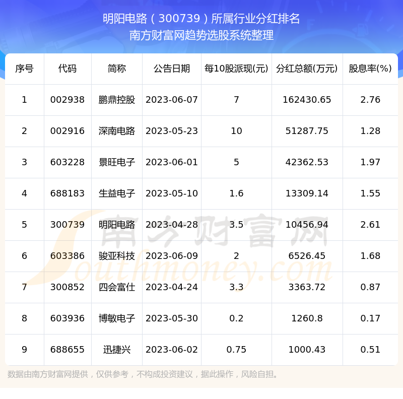 按照趋势选股系统统计,明阳电路所属行业为印制电路板行业,印制电路板行业分红排名情况如下表: