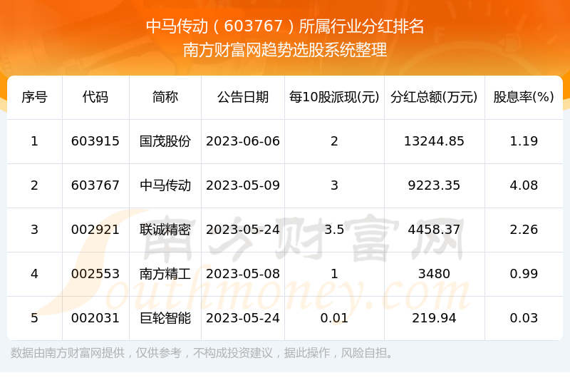 二、中马传动603767行业分红排名