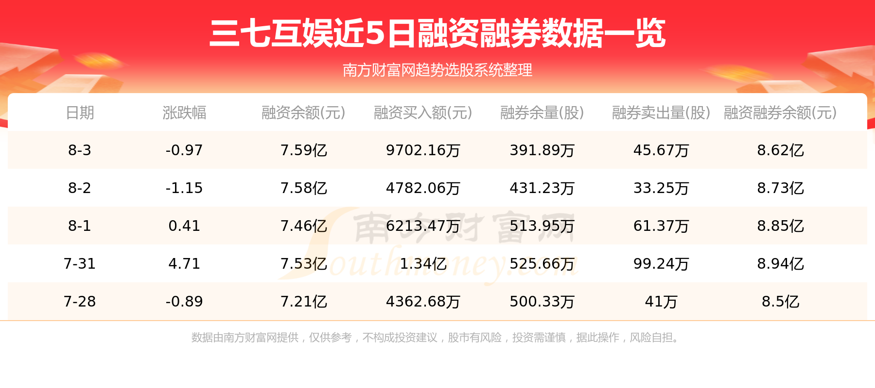 三七互娱8月3日融券信息显示,融资方面,当日融资买入9702.16万元,融资偿还9678.43万元,融资净买额23.73万元。融券方面,融券卖出45.67万股,融券偿还85.01万股,融券余量391.89万股,融券余额1.04亿元。融资融券余额8.62亿元。近5日融资融券数据一览见下表: