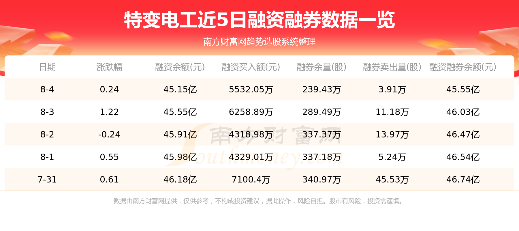 特变电工8月4日融券信息显示,融资方面,当日融资买入5532.05万元,融资偿还9543.98万元,融资净买额-4011.93万元。融券方面,融券卖出3.91万股,融券偿还53.97万股,融券余量239.43万股,融券余额3991.22万元。融资融券余额45.55亿元。近5日融资融券数据一览见下表: