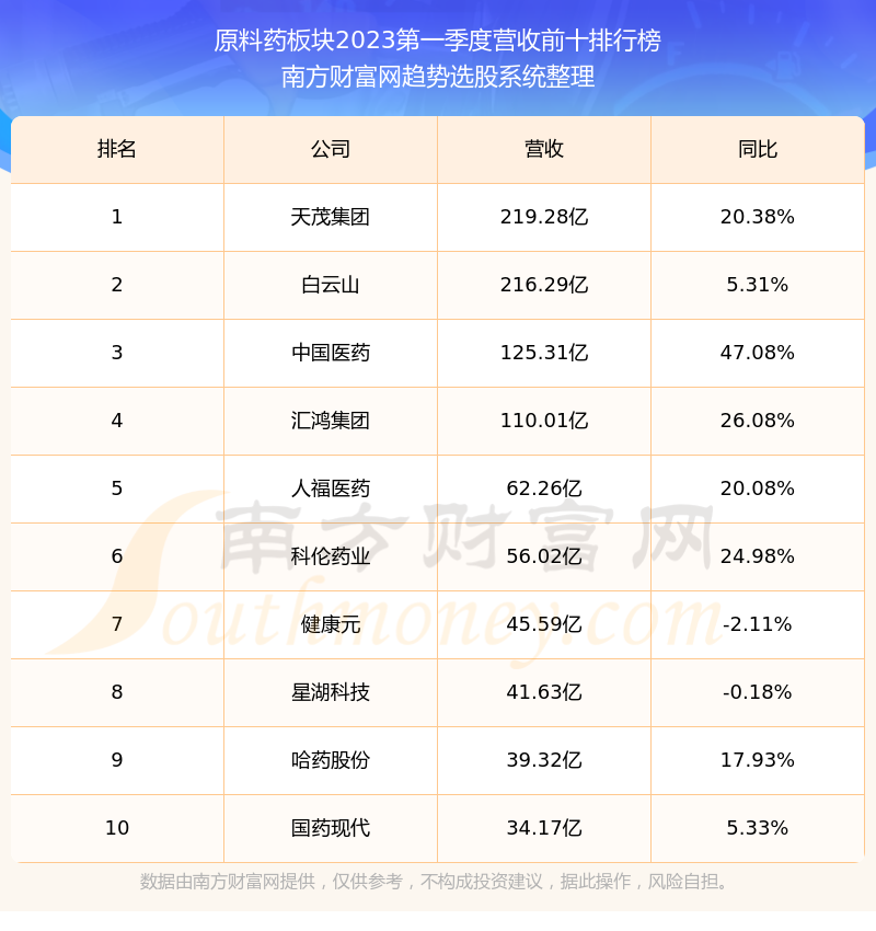 按照趋势选股系统统计,该股所属板块为原料药板块,该板块共有108只股票,圣诺生物2023第一季度营收在该板块中排名为第101名,该板块2023第一季度营收排名前十的股票如下表: