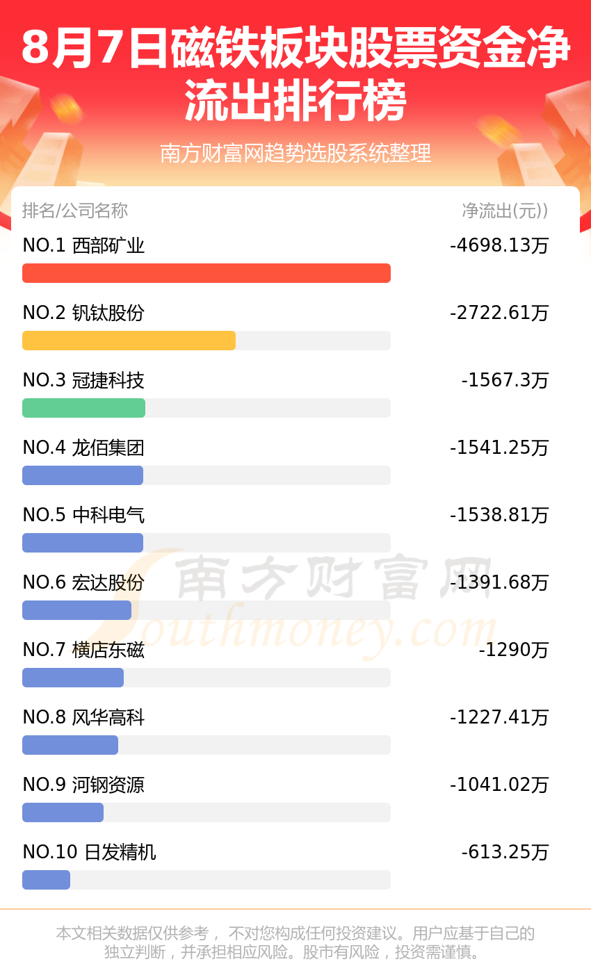 磁铁板块股票8月7日资金净流出情况来看,西部矿业位列第一位,主力净流出达到-4698.13万元;钒钛股份排名第二,主力净流出为-2722.61万元;冠捷科技排名第三,主力净流出-1567.3万元。主力净流出排名前10的还有:龙佰集团、中科电气、宏达股份、横店东磁、风华高科、河钢资源、日发精机。