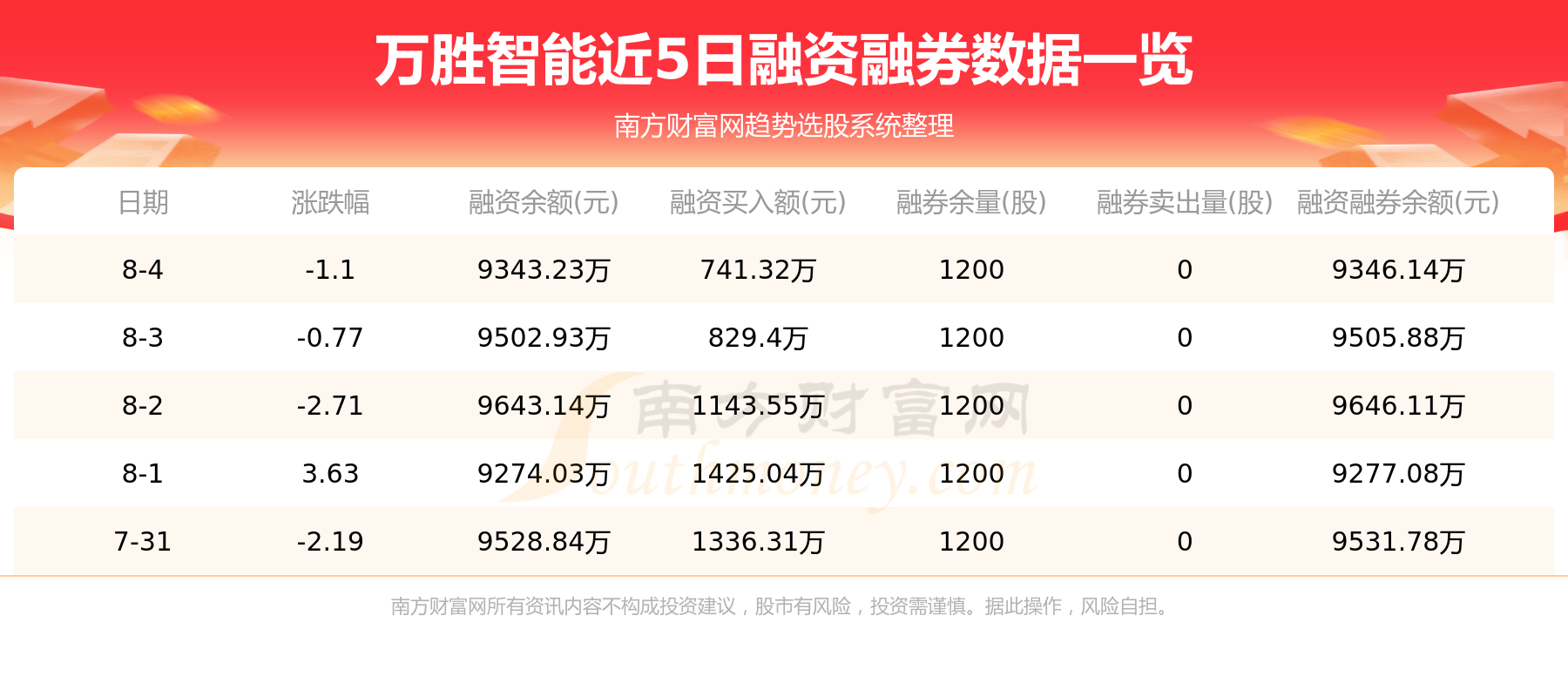 万胜智能8月4日融券信息显示,融资方面,当日融资买入741.32万元,融资偿还901.03万元,融资净买额-159.7万元。近5日融资融券数据一览见下表: