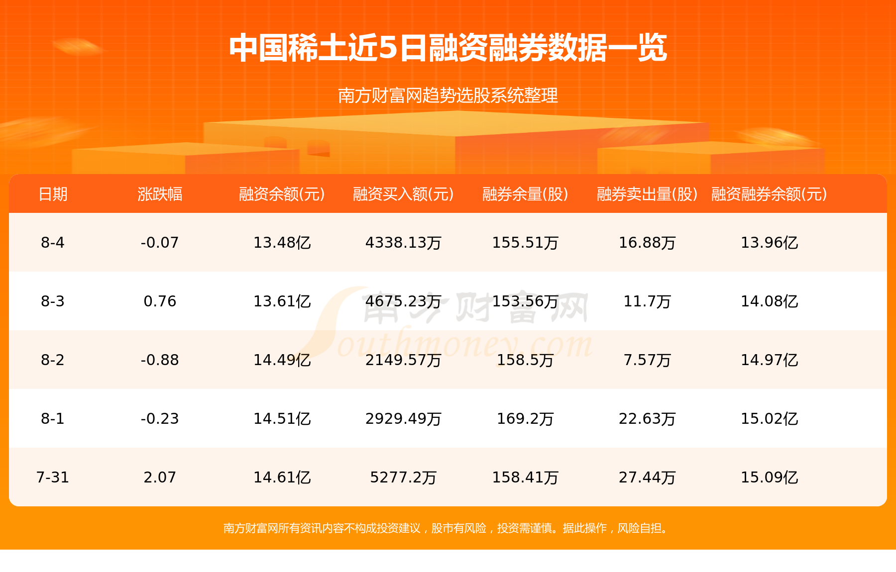 中国稀土8月4日融券信息显示,融资方面,当日融资买入4338.13万元,融资偿还5586.89万元,融资净买额-1248.75万元。融券方面,融券卖出16.88万股,融券偿还14.93万股,融券余量155.51万股,融券余额4742.92万元。融资融券余额13.96亿元。近5日融资融券数据一览见下表: