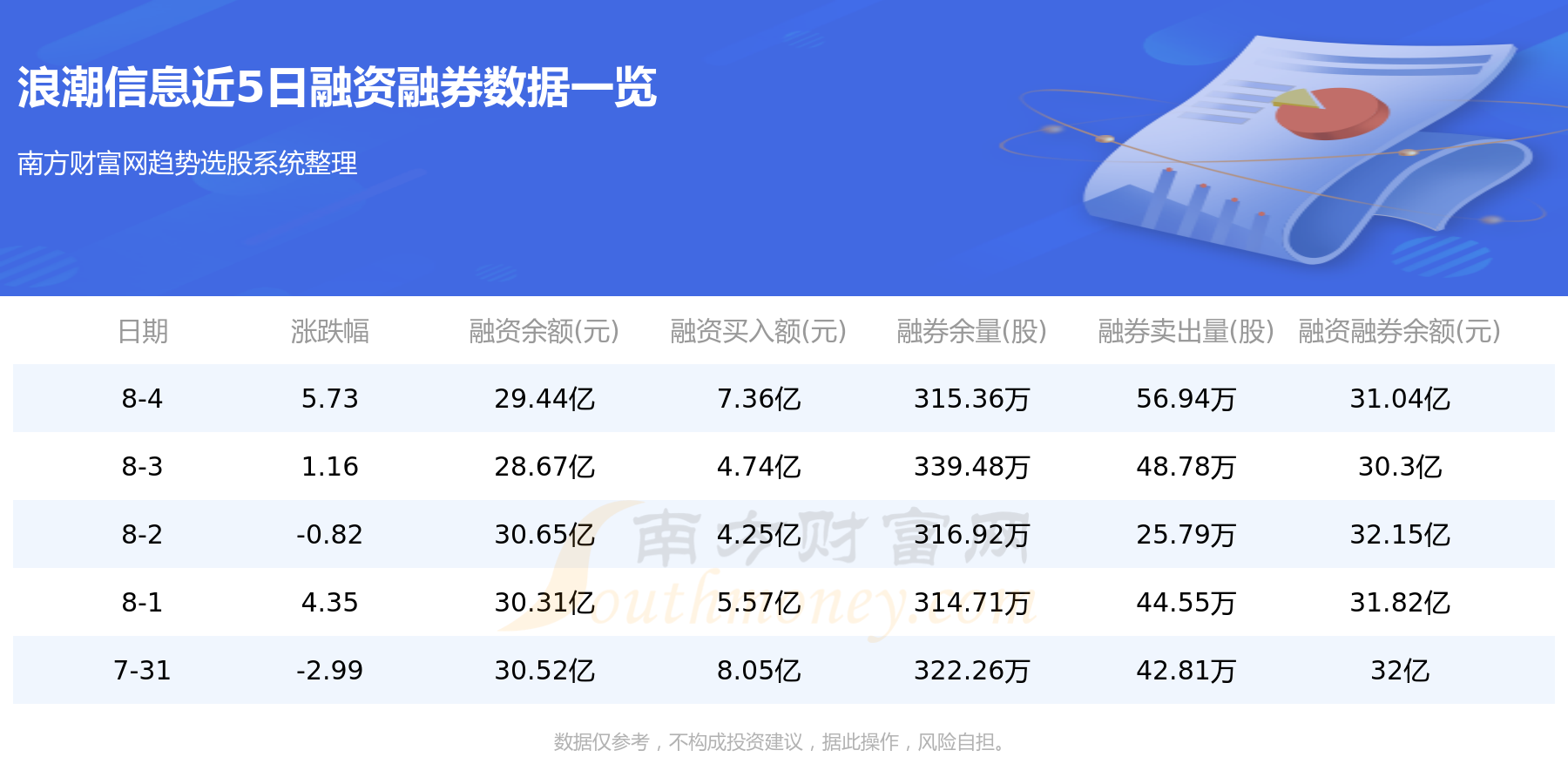 8月4日浪潮信息融券信息显示,融资方面,当日融资买入7.36亿元,融资偿还6.6亿元,融资净买额7684.15万元。融券方面,融券卖出56.94万股,融券偿还81.06万股,融券余量315.36万股,融券余额1.6亿元。融资融券余额31.04亿元。近5日融资融券数据一览见下表: