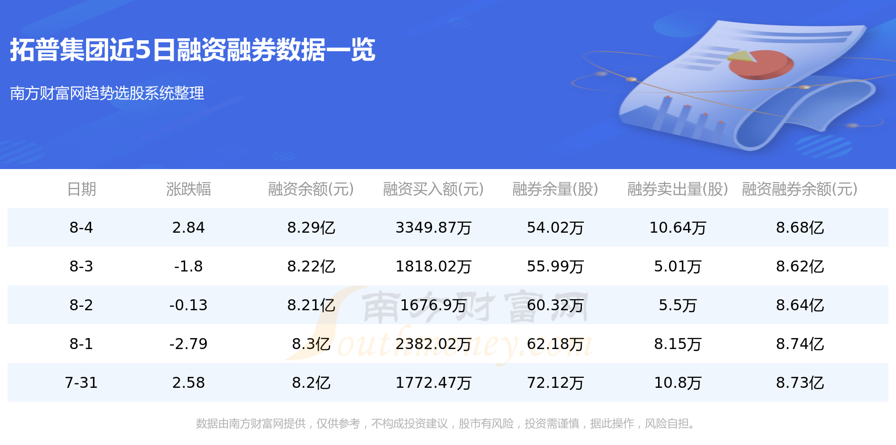 拓普集团8月4日融券信息显示,融资方面,当日融资买入3349.87万元,融资偿还2634.83万元,融资净买额715.04万元。融券方面,融券卖出10.64万股,融券偿还12.61万股,融券余量54.02万股,融券余额3889.22万元。融资融券余额8.68亿元。