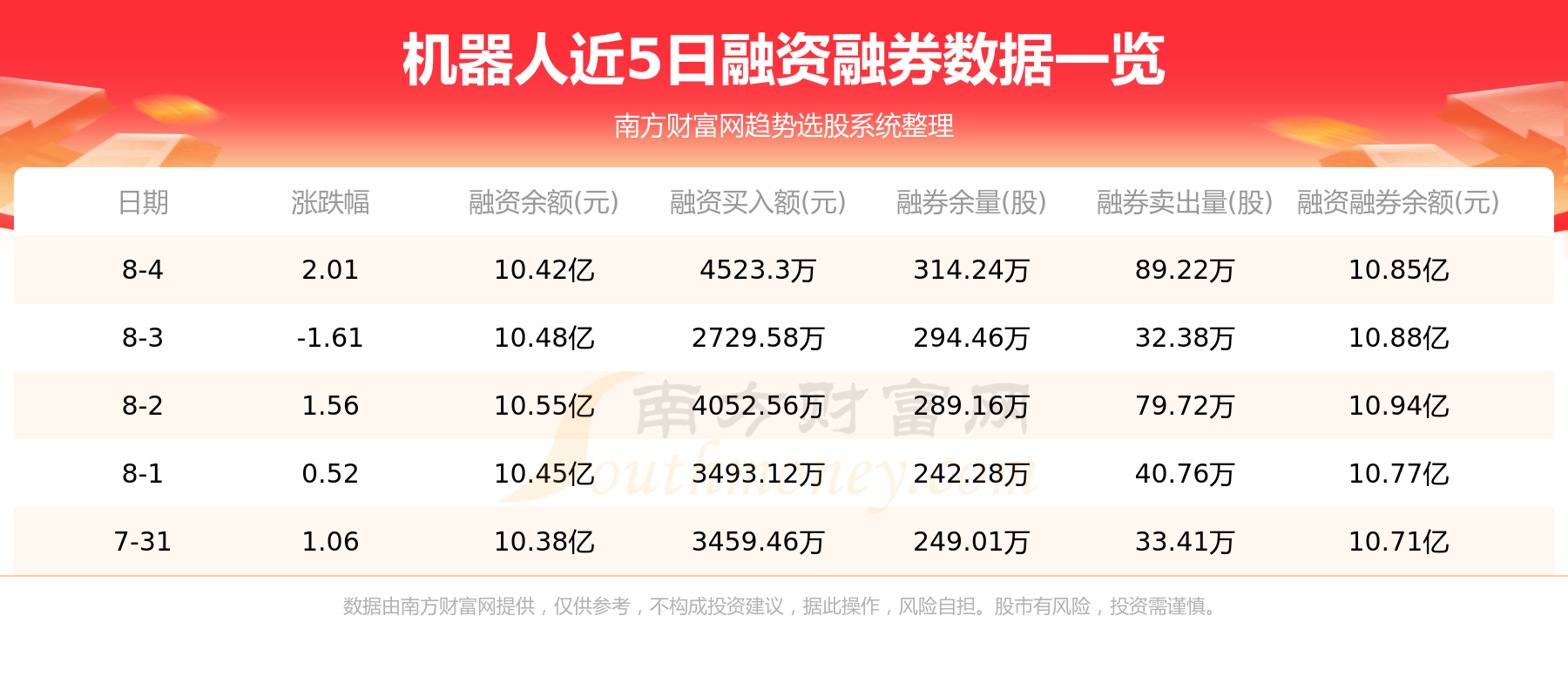 8月4日机器人融券信息显示,融资方面,当日融资买入4523.3万元,融资偿还5213.32万元,融资净买额-690.03万元。融券方面,融券卖出89.22万股,融券偿还69.44万股,融券余量314.24万股,融券余额4311.42万元。融资融券余额10.85亿元。近5日融资融券数据一览见下表: