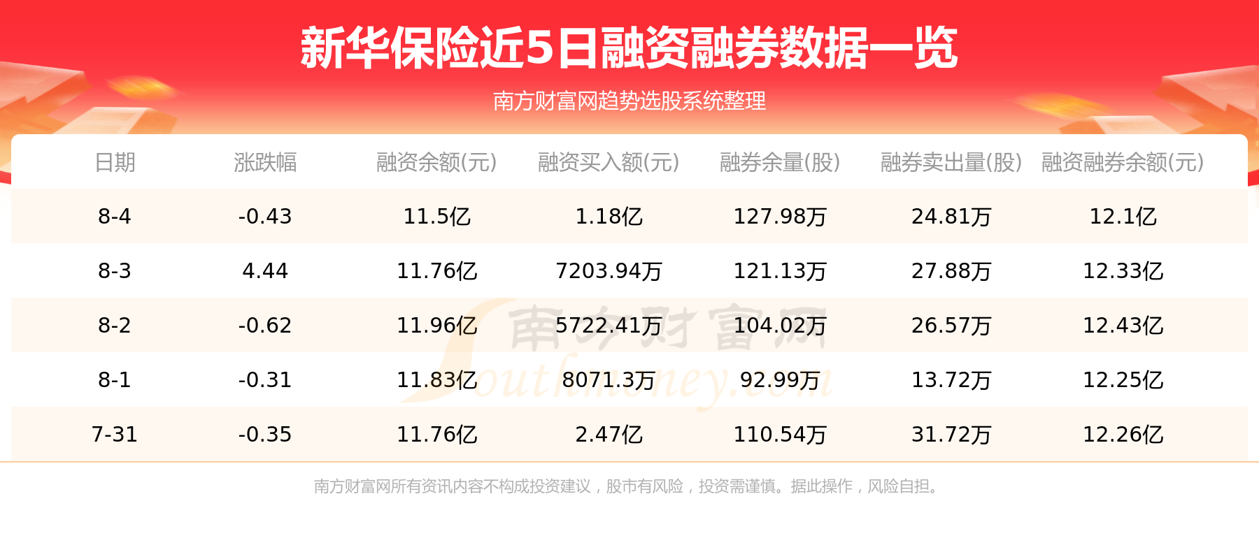 新华保险8月4日融券信息显示,融资方面,当日融资买入1.18亿元,融资偿还1.44亿元,融资净买额-2565.79万元。融券方面,融券卖出24.81万股,融券偿还17.96万股,融券余量127.98万股,融券余额5989.46万元。融资融券余额12.1亿元。近5日融资融券数据一览见下表: