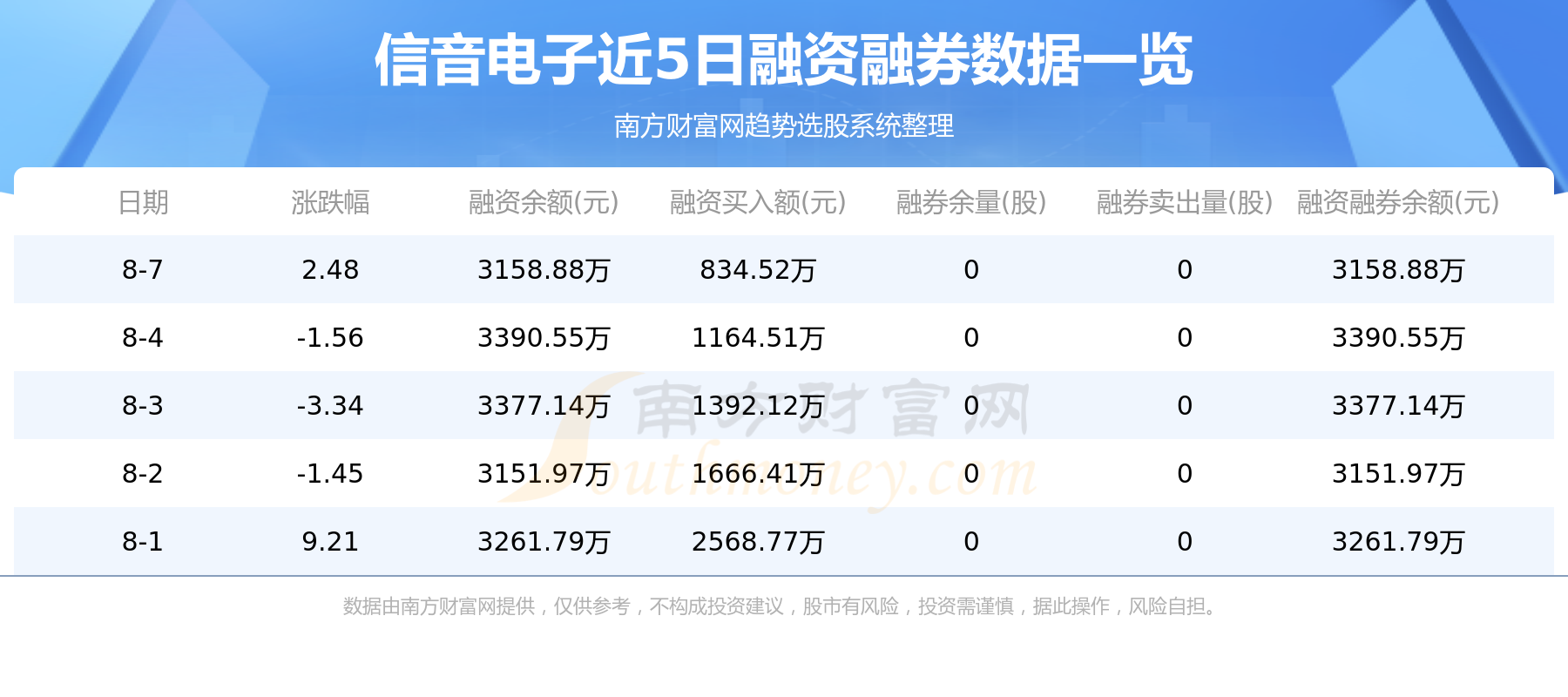 8月7日信音电子融券信息显示,融资方面,当日融资买入834.52万元,融资偿还1066.19万元,融资净买额-231.67万元。
