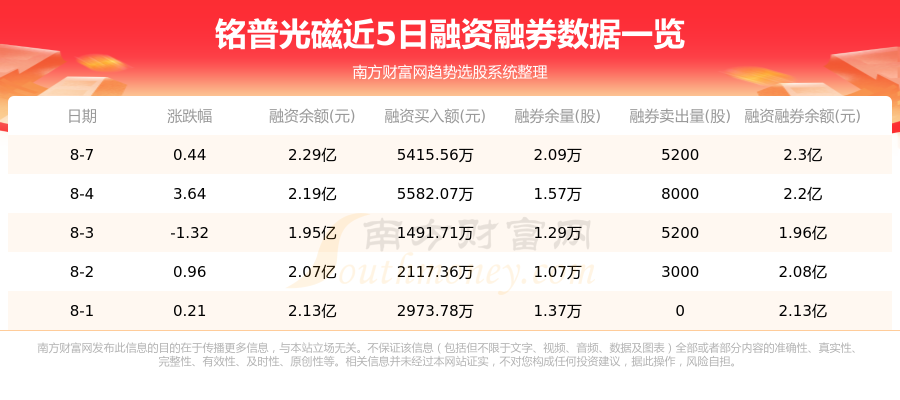 铭普光磁8月7日融券信息显示,融资方面,当日融资买入5415.56万元,融资偿还4435.04万元,融资净买额980.52万元。近5日融资融券数据一览见下表: