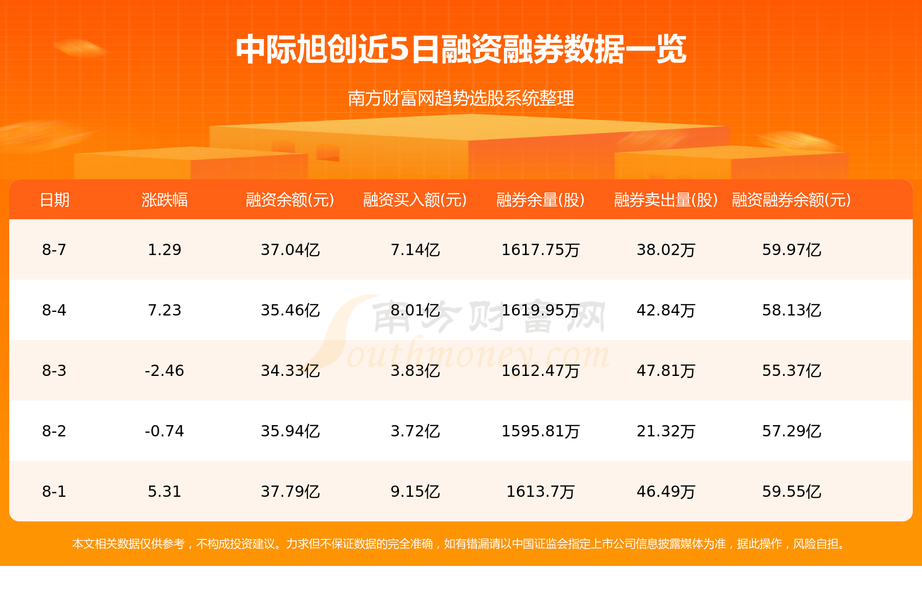8月7日中际旭创融券信息显示,融资方面,当日融资买入7.14亿元,融资偿还5.56亿元,融资净买额1.58亿元。融券方面,融券卖出38.02万股,融券偿还40.23万股,融券余量1617.75万股,融券余额22.93亿元。融资融券余额59.97亿元。近5日融资融券数据一览见下表: