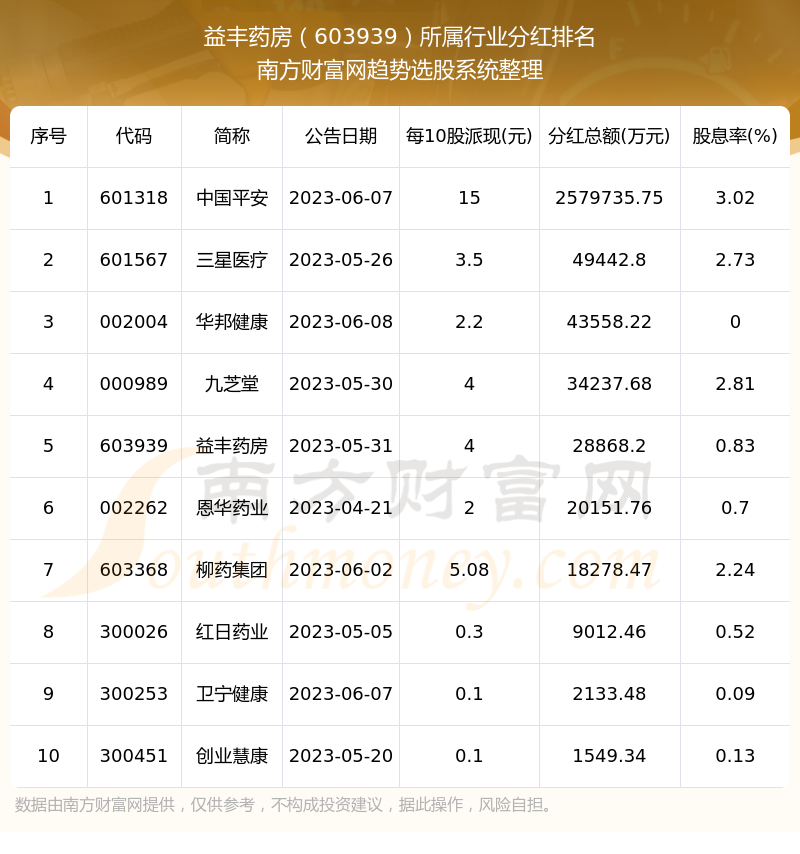 按照趋势选股系统统计,益丰药房所属行业为医药商业行业,医药商业行业分红排名情况如下表: