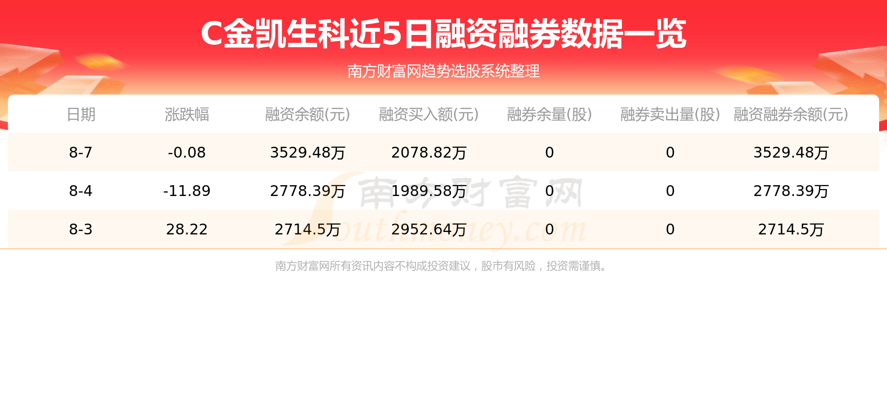 8月7日C金凯生科融券信息显示,融资方面,当日融资买入2078.82万元,融资偿还1327.72万元,融资净买额751.1万元。近5日融资融券数据一览见下表: