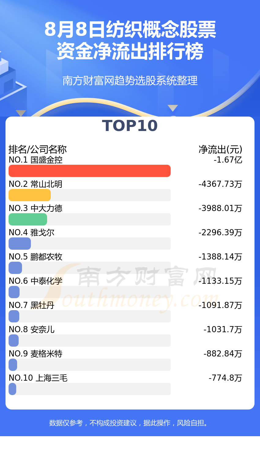 纺织概念股票8月8日资金净流出情况来看,国盛金控位列第一位,主力净流出达到-1.67亿元;常山北明排名第二,主力净流出为-4367.73万元;中大力德排名第三,主力净流出-3988.01万元。主力净流出排名前10的还有:雅戈尔、鹏都农牧、中泰化学、黑牡丹、安奈儿、麦格米特、上海三毛。