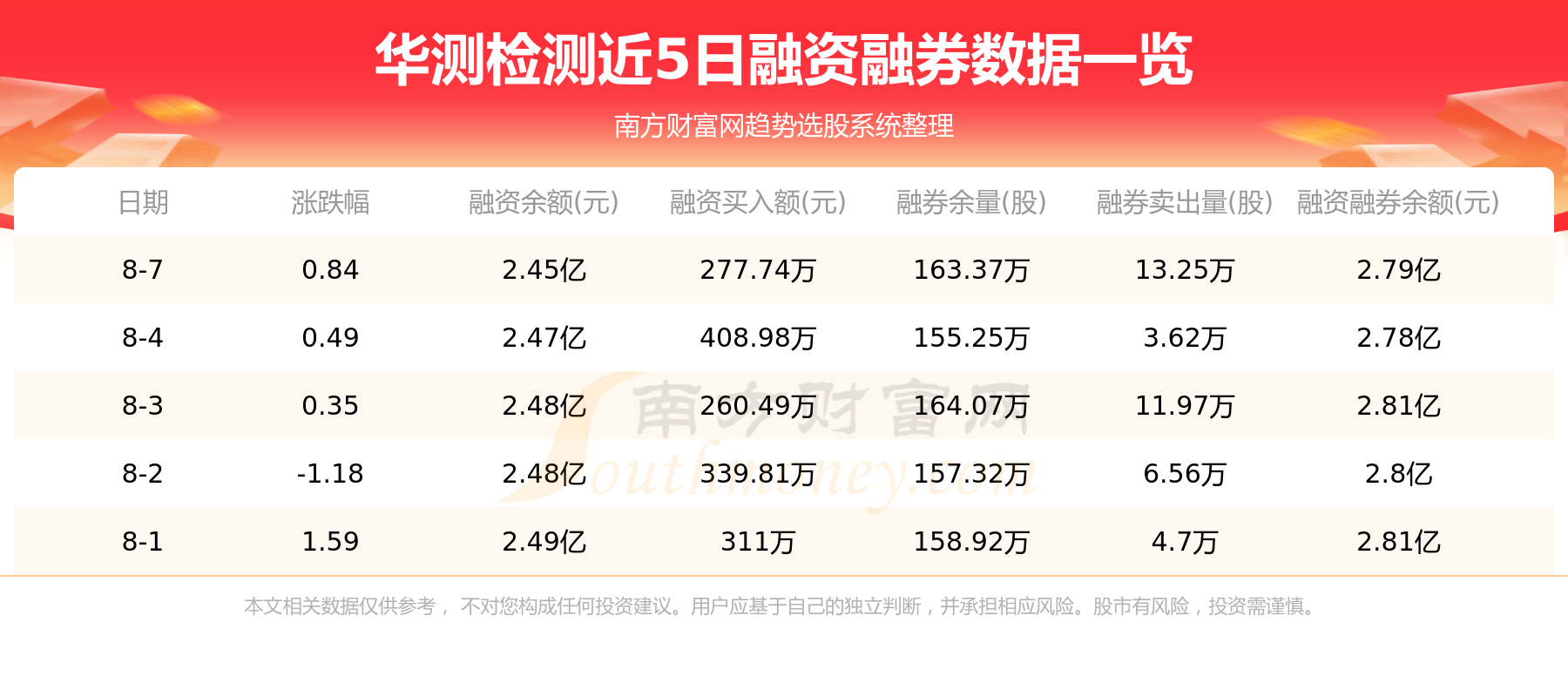 华测检测8月7日融券信息显示,融资方面,当日融资买入277.74万元,融资偿还436.03万元,融资净买额-158.29万元。融券方面,融券卖出13.25万股,融券偿还5.13万股,融券余量163.37万股,融券余额3352.36万元。融资融券余额2.79亿元。近5日融资融券数据一览见下表: