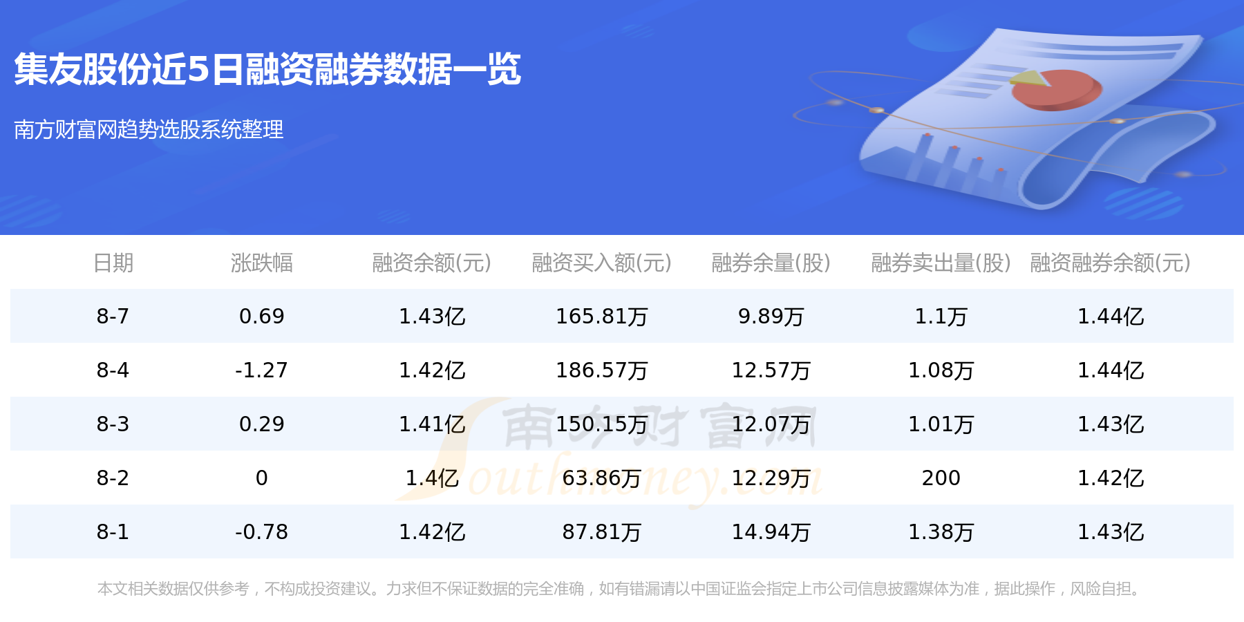 8月7日集友股份融券信息显示,融资方面,当日融资买入165.81万元,融资偿还130.23万元,融资净买额35.59万元。融券方面,融券卖出1.1万股,融券偿还3.78万股,融券余量9.89万股,融券余额100.99万元。融资融券余额1.44亿元。近5日融资融券数据一览见下表: