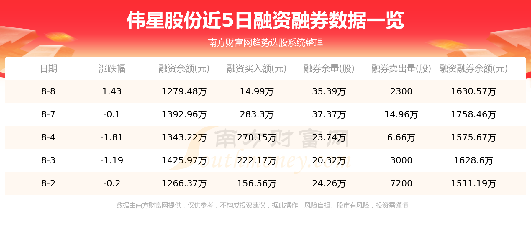 伟星股份8月8日融券信息显示,融资方面,当日融资买入14.99万元,融资偿还128.47万元,融资净买额-113.48万元。融券方面,融券卖出2300股,融券偿还2.21万股,融券余量35.39万股,融券余额351.08万元。融资融券余额1630.57万元。