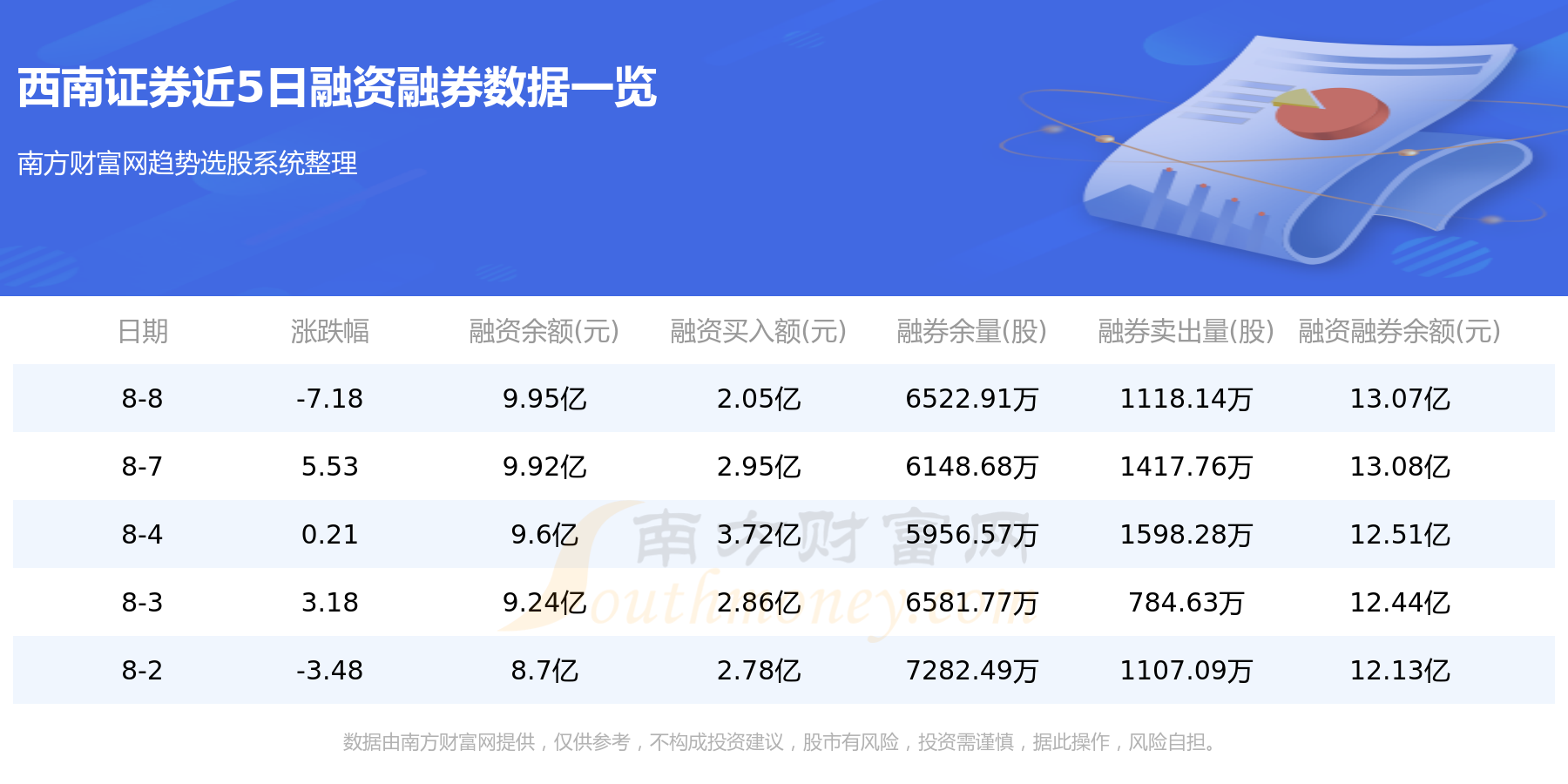 8月8日西南证券融券信息显示,融资方面,当日融资买入2.05亿元,融资偿还2.02亿元,融资净买额374.14万元。融券方面,融券卖出1118.14万股,融券偿还743.9万股,融券余量6522.91万股,融券余额3.12亿元。融资融券余额13.07亿元。近5日融资融券数据一览见下表: