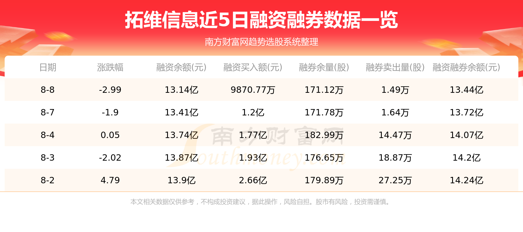 拓维信息8月8日融券信息显示,融资方面,当日融资买入9870.77万元,融资偿还1.25亿元,融资净买额-2659.77万元。融券方面,融券卖出1.49万股,融券偿还2.15万股,融券余量171.12万股,融券余额3001.4万元。融资融券余额13.44亿元。