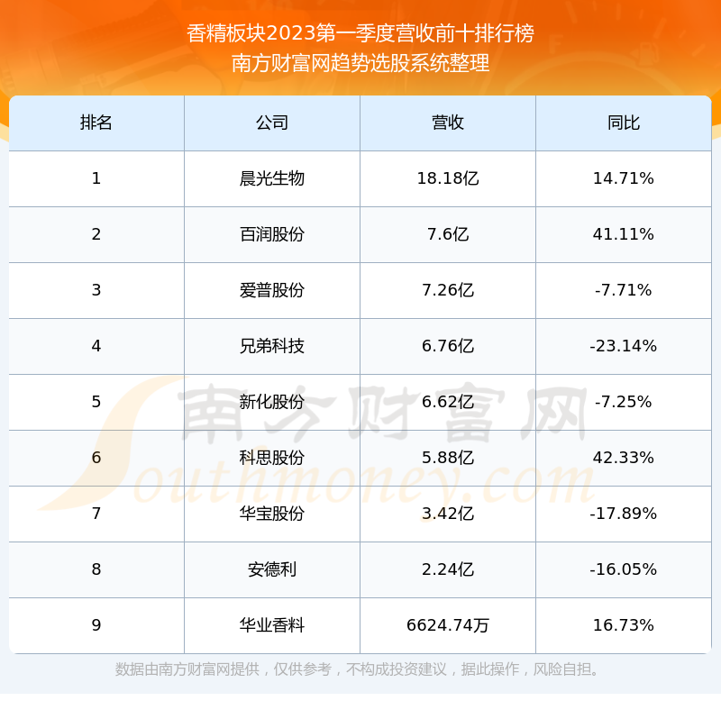 按照趋势选股系统统计,该股所属板块为香精板块,该板块共有9只股票,爱普股份2023第一季度营收在该板块中排名为第3名,该板块2023第一季度营收排名前十的股票如下表:
