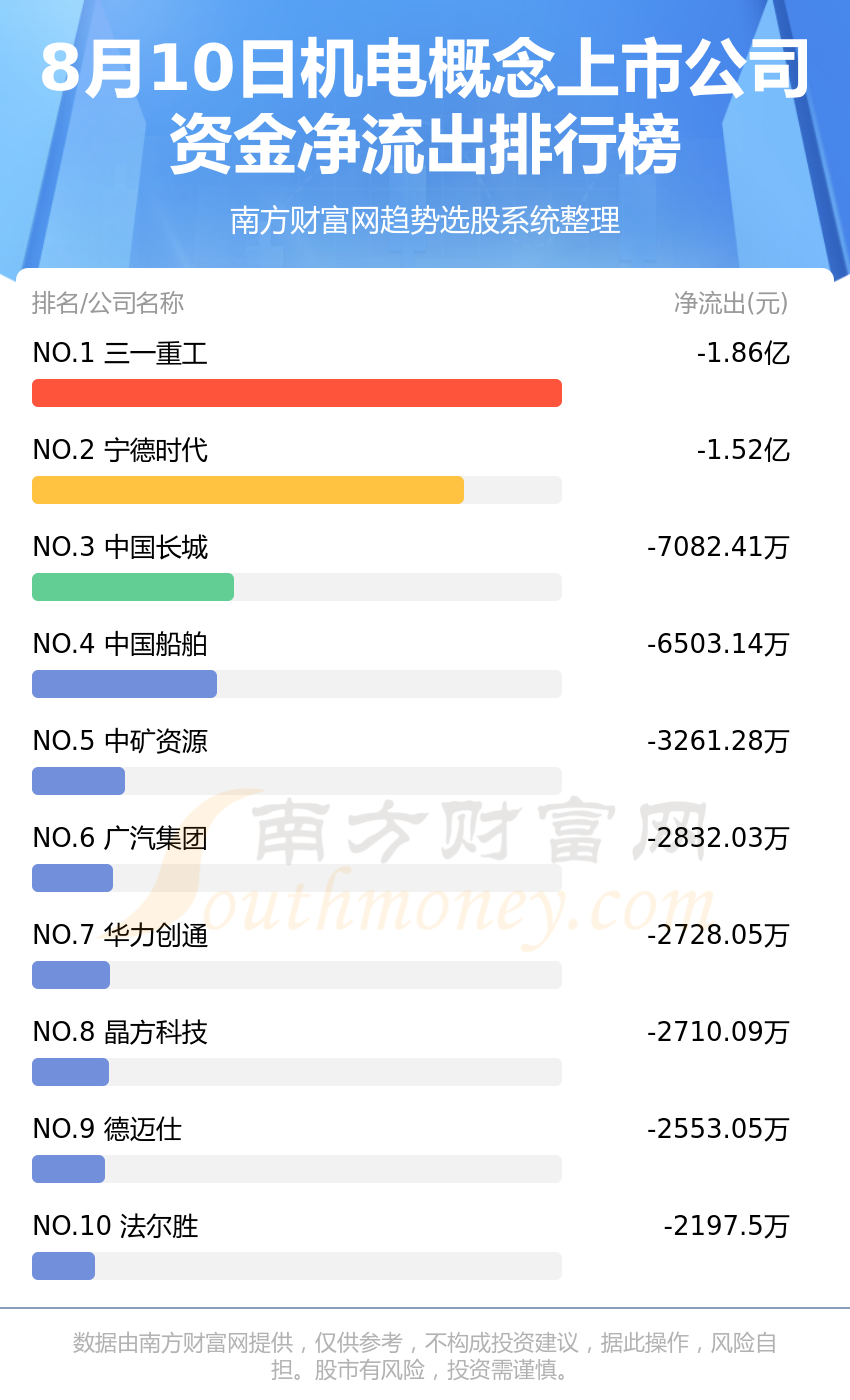 机电概念上市公司8月10日资金净流出情况来看,三一重工位列第一位,主力净流出达到-1.86亿元;宁德时代排名第二,主力净流出为-1.52亿元;中国长城排名第三,主力净流出-7082.41万元。主力净流出排名前10的还有:中国船舶、中矿资源、广汽集团、华力创通、晶方科技、德迈仕、法尔胜。
