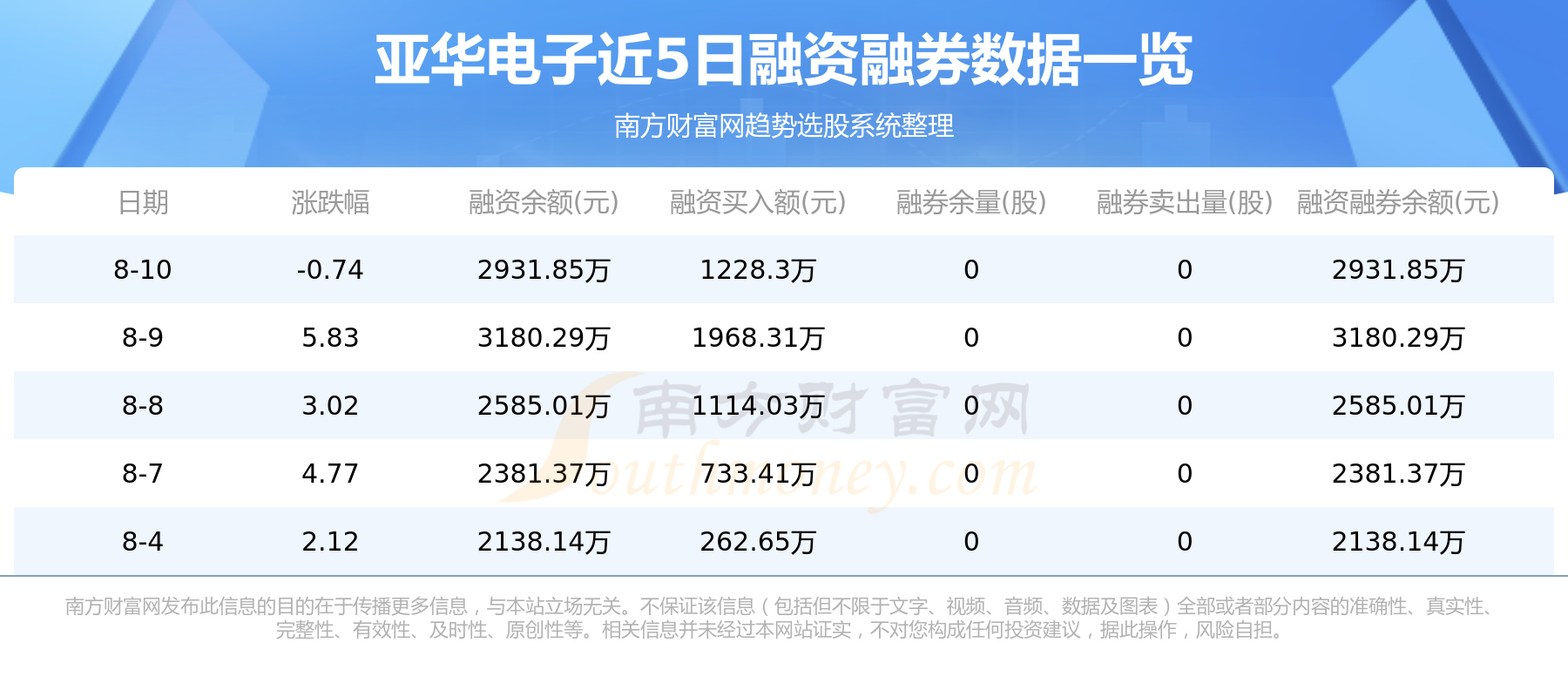亚华电子8月10日融券信息显示,融资方面,当日融资买入1228.3万元,融资偿还1476.74万元,融资净买额-248.44万元。近5日融资融券数据一览见下表: