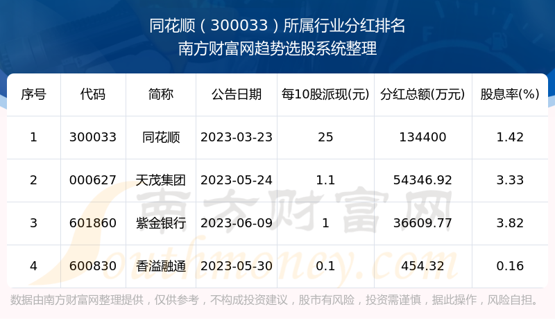 按照趋势选股系统统计,同花顺所属行业为软件开发行业,软件开发行业分红排名情况如下表: