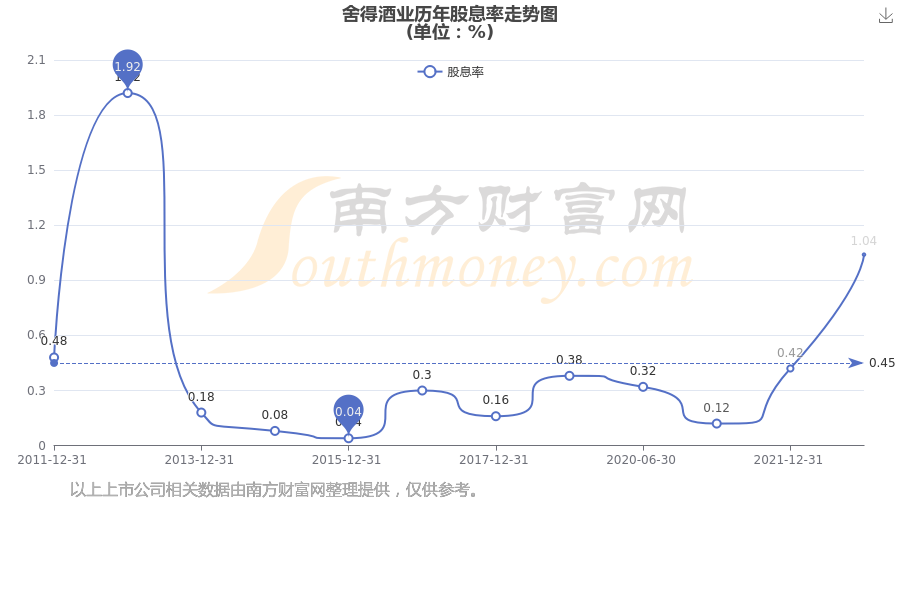 近年舍得酒业年度股息率走势如下图: