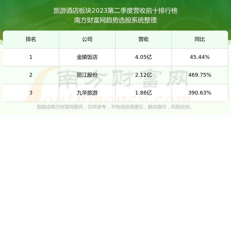 按照趋势选股系统统计,该股所属板块为旅游酒店板块,该板块共有3只股票,中国中免2023第二季度营收在该板块中排名为第3名,该板块2023第二季度营收排名前十的股票如下表: