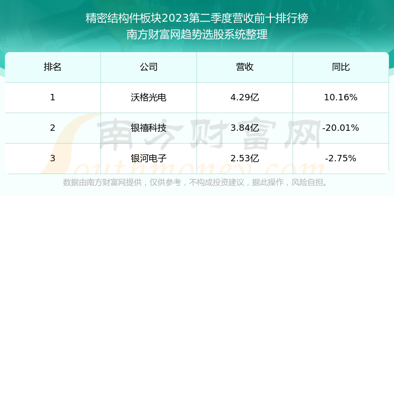按照趋势选股系统统计,该股所属板块为精密结构件板块,该板块共有3只股票,迈信林2023第二季度营收在该板块中排名为第3名,该板块2023第二季度营收排名前十的股票如下表:
