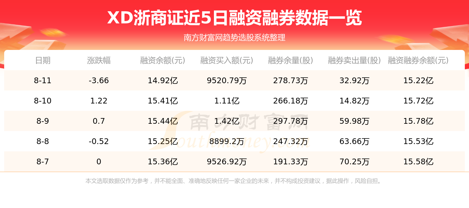 8月11日XD浙商证融券信息显示,融资方面,当日融资买入9520.79万元,融资偿还1.45亿元,融资净买额-4979.22万元。融券方面,融券卖出32.92万股,融券偿还20.36万股,融券余量278.73万股,融券余额3077.22万元。融资融券余额15.22亿元。近5日融资融券数据一览见下表: