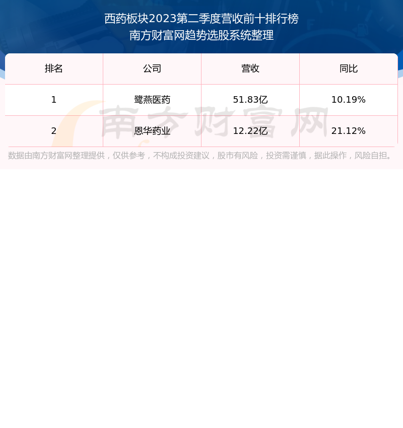 按照趋势选股系统统计,该股所属板块为西药板块,该板块共有2只股票,达仁堂2023第二季度营收在该板块中排名为第2名,该板块2023第二季度营收排名前十的股票如下表: