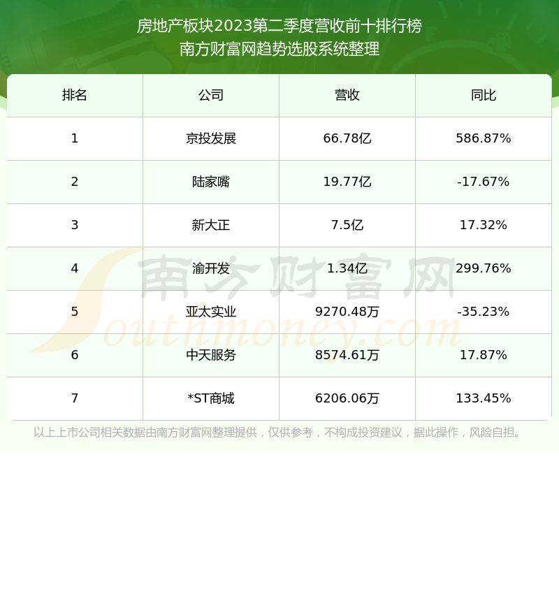 按照趋势选股系统统计,该股所属板块为房地产板块,该板块共有7只股票,*ST同达2023第二季度营收在该板块中排名为第7名,该板块2023第二季度营收排名前十的股票如下表: