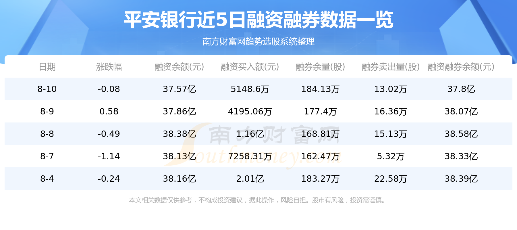 平安银行8月10日融券信息显示,融资方面,当日融资买入5148.6万元,融资偿还7988.97万元,融资净买额-2840.38万元。融券方面,融券卖出13.02万股,融券偿还6.29万股,融券余量184.13万股,融券余额2238.98万元。融资融券余额37.8亿元。近5日融资融券数据一览见下表: