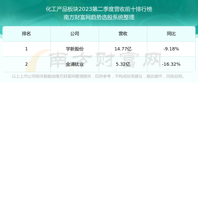 按照趋势选股系统统计,该股所属板块为化工产品板块,该板块共有2只股票,新疆天业2023第二季度营收在该板块中排名为第2名,该板块2023第二季度营收排名前十的股票如下表: