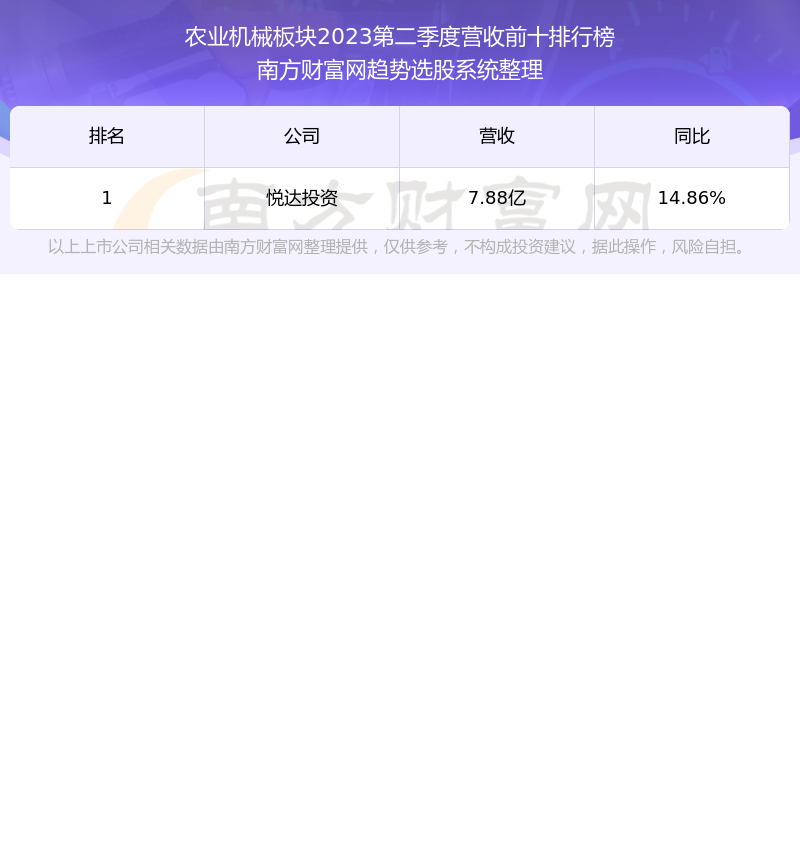 按照趋势选股系统统计,该股所属板块为农业机械板块,该板块共有1只股票,天鹅股份2023第二季度营收在该板块中排名为第1名,该板块2023第二季度营收排名前十的股票如下表: