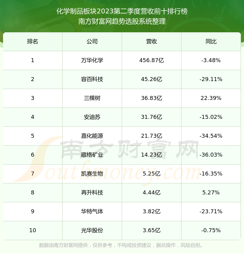 按照趋势选股系统统计,该股所属板块为化学制品板块,该板块共有17只股票,昊华科技2023第二季度营收在该板块中排名为第17名,该板块2023第二季度营收排名前十的股票如下表: