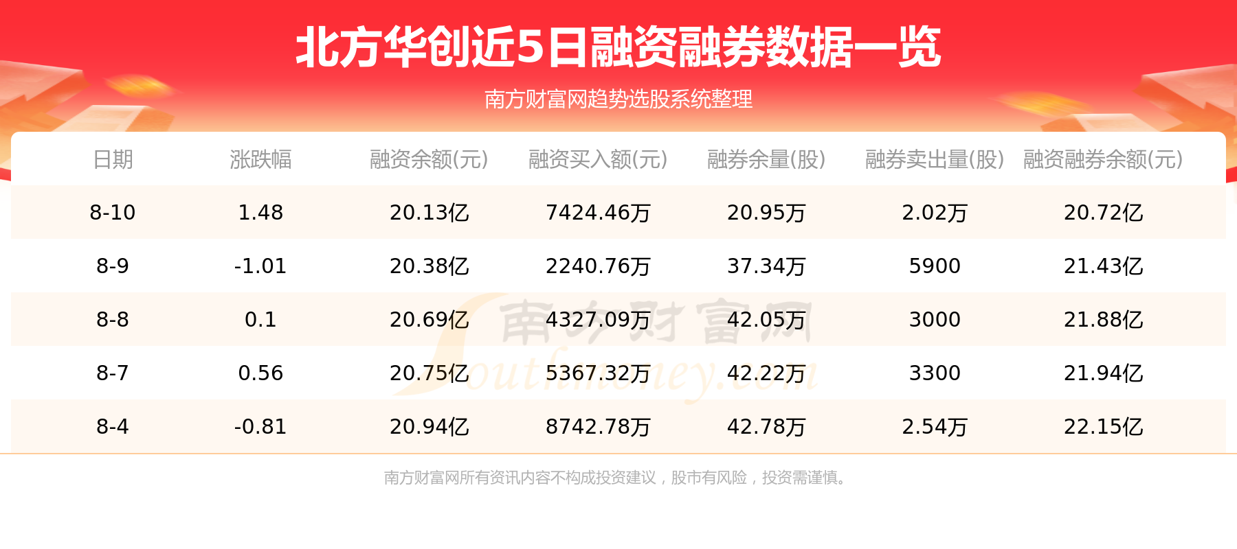 8月10日北方华创融券信息显示,融资方面,当日融资买入7424.46万元,融资偿还9972.24万元,融资净买额-2547.78万元。融券方面,融券卖出2.02万股,融券偿还18.41万股,融券余量20.95万股,融券余额5963.14万元。融资融券余额20.72亿元。