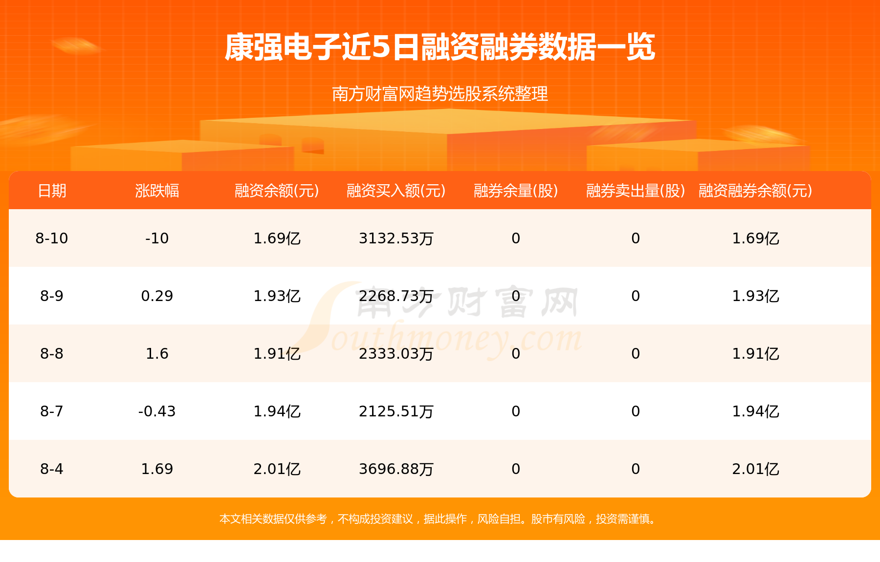 8月10日康强电子融券信息显示,融资方面,当日融资买入3132.53万元,融资偿还5532.8万元,融资净买额-2400.28万元。近5日融资融券数据一览见下表: