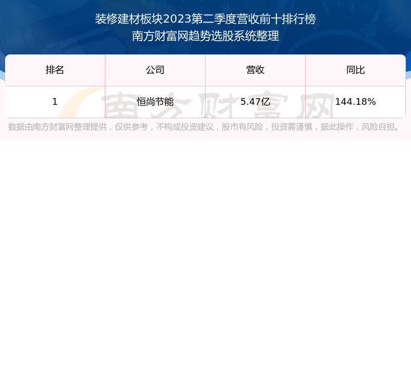 按照趋势选股系统统计,该股所属板块为装修建材板块,该板块共有1只股票,恒林股份2023第二季度营收在该板块中排名为第1名,该板块2023第二季度营收排名前十的股票如下表: