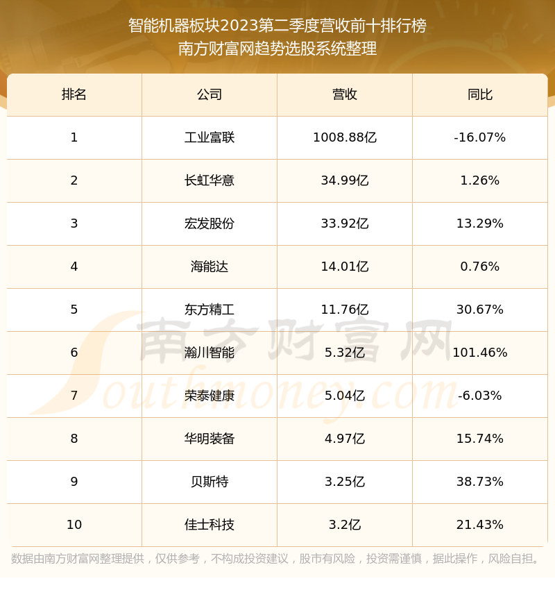 按照趋势选股系统统计,该股所属板块为智能机器板块,该板块共有14只股票,泰禾智能2023第二季度营收在该板块中排名为第14名,该板块2023第二季度营收排名前十的股票如下表: