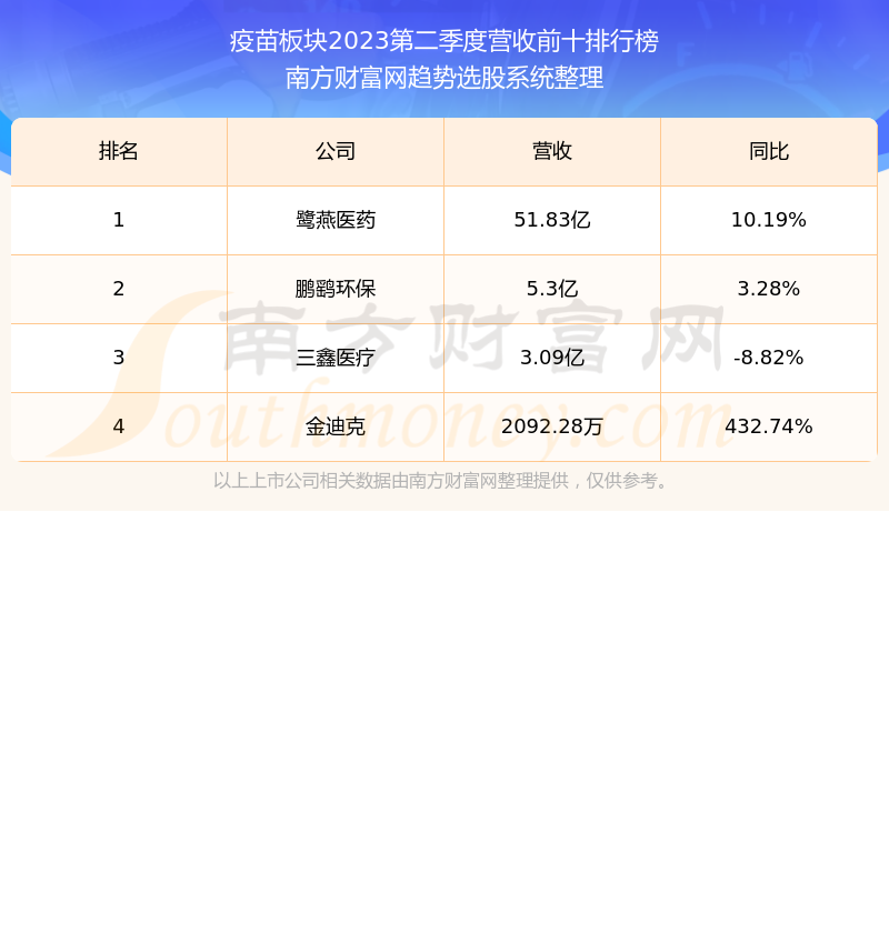 按照趋势选股系统统计,该股所属板块为疫苗板块,该板块共有4只股票,康希诺2023第二季度营收在该板块中排名为第4名,该板块2023第二季度营收排名前十的股票如下表:
