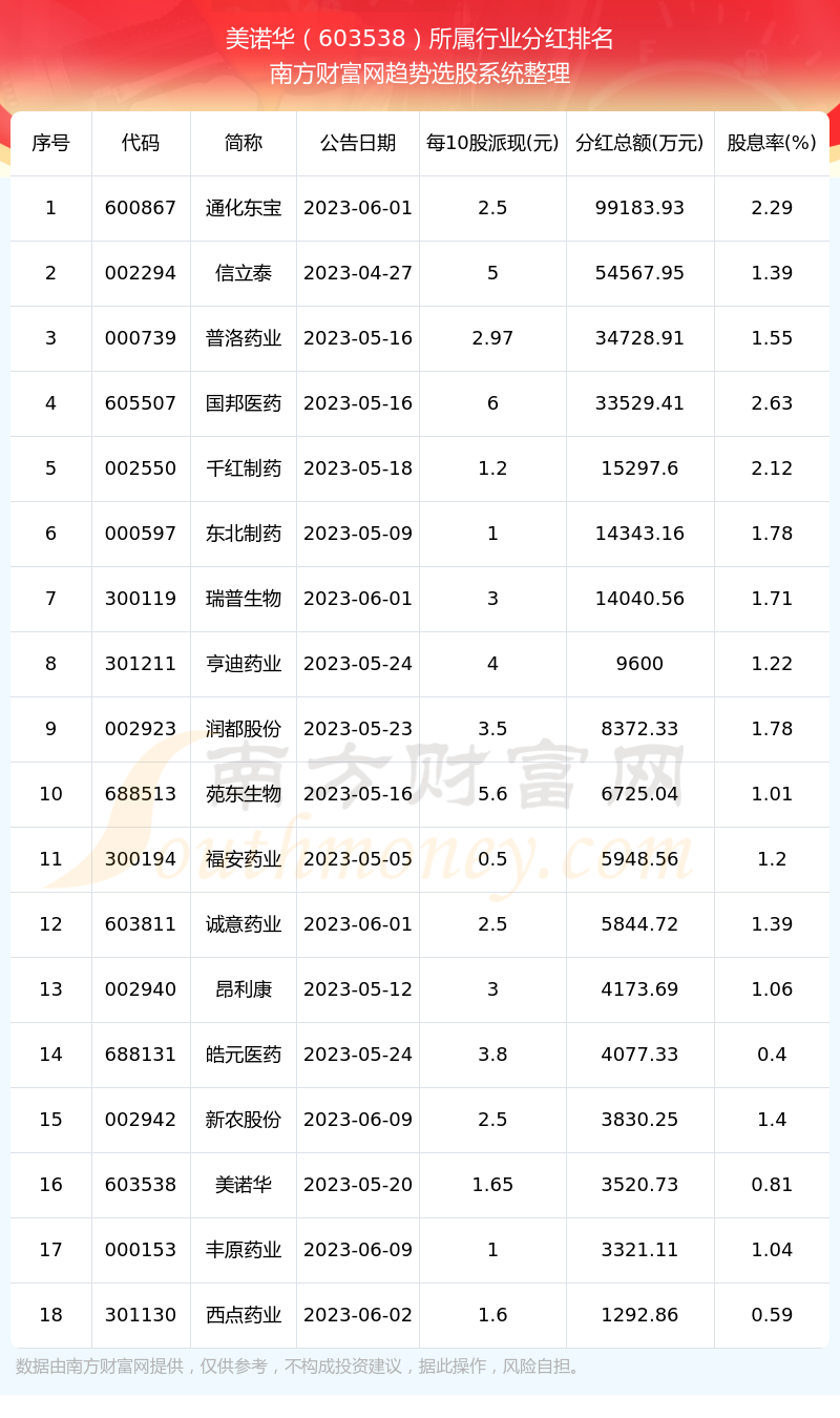 按照趋势选股系统统计,美诺华所属行业为原料药行业,原料药行业分红排名情况如下表: