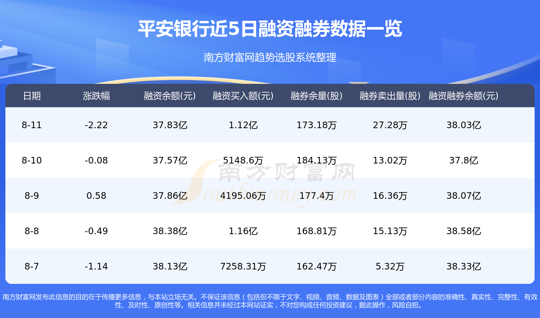8月11日平安银行融券信息显示,融资方面,当日融资买入1.12亿元,融资偿还8715.46万元,融资净买额2505.13万元。融券方面,融券卖出27.28万股,融券偿还38.23万股,融券余量173.18万股,融券余额2059.07万元。融资融券余额38.03亿元。近5日融资融券数据一览见下表: