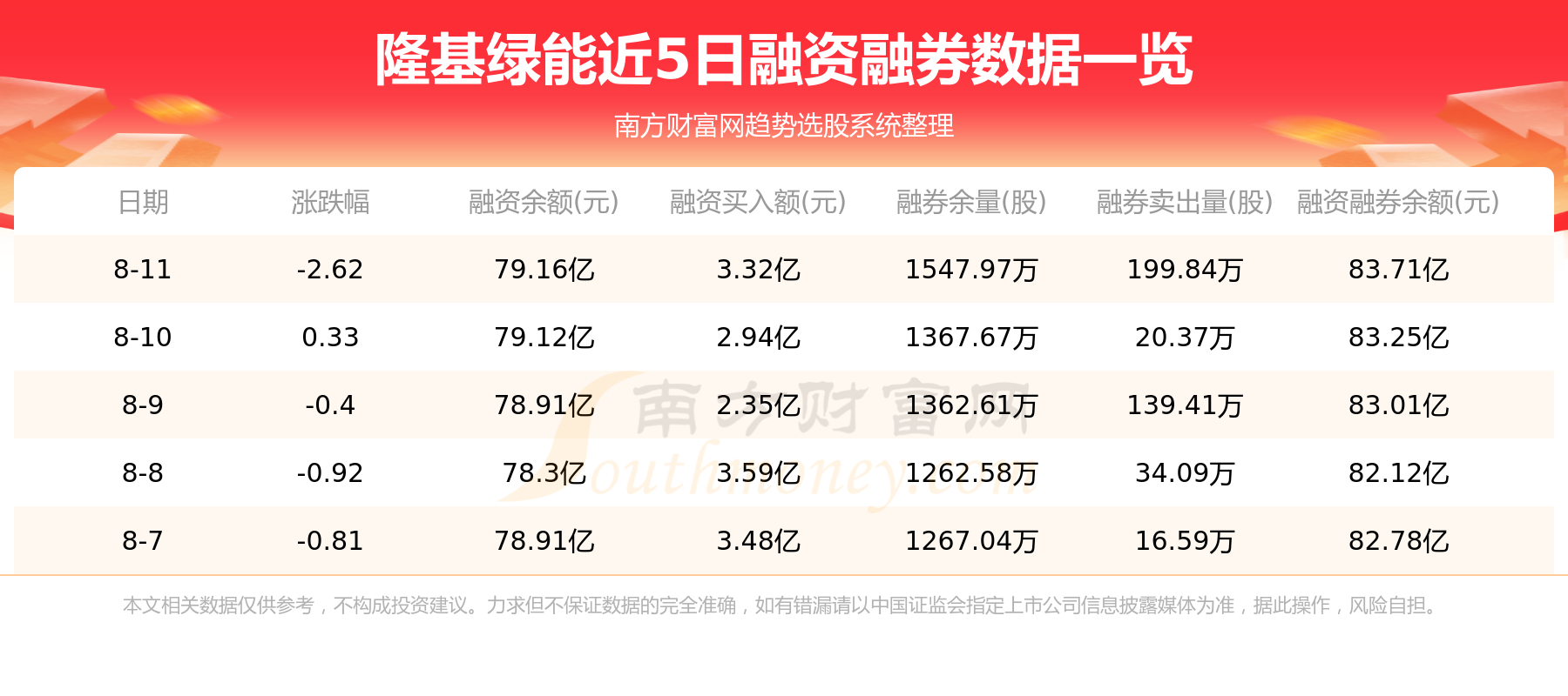 隆基绿能8月11日融券信息显示,融资方面,当日融资买入3.32亿元,融资偿还3.28亿元,融资净买额429.6万元。融券方面,融券卖出199.84万股,融券偿还19.54万股,融券余量1547.97万股,融券余额4.55亿元。融资融券余额83.71亿元。近5日融资融券数据一览见下表: