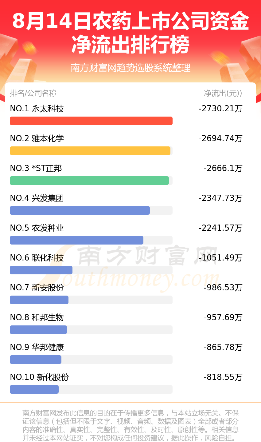农药上市公司8月14日资金净流出情况来看,永太科技位列第一位,主力净流出达到-2730.21万元;雅本化学排名第二,主力净流出为-2694.74万元;*ST正邦排名第三,主力净流出-2666.1万元。主力净流出排名前10的还有:兴发集团、农发种业、联化科技、新安股份、和邦生物、华邦健康、新化股份。