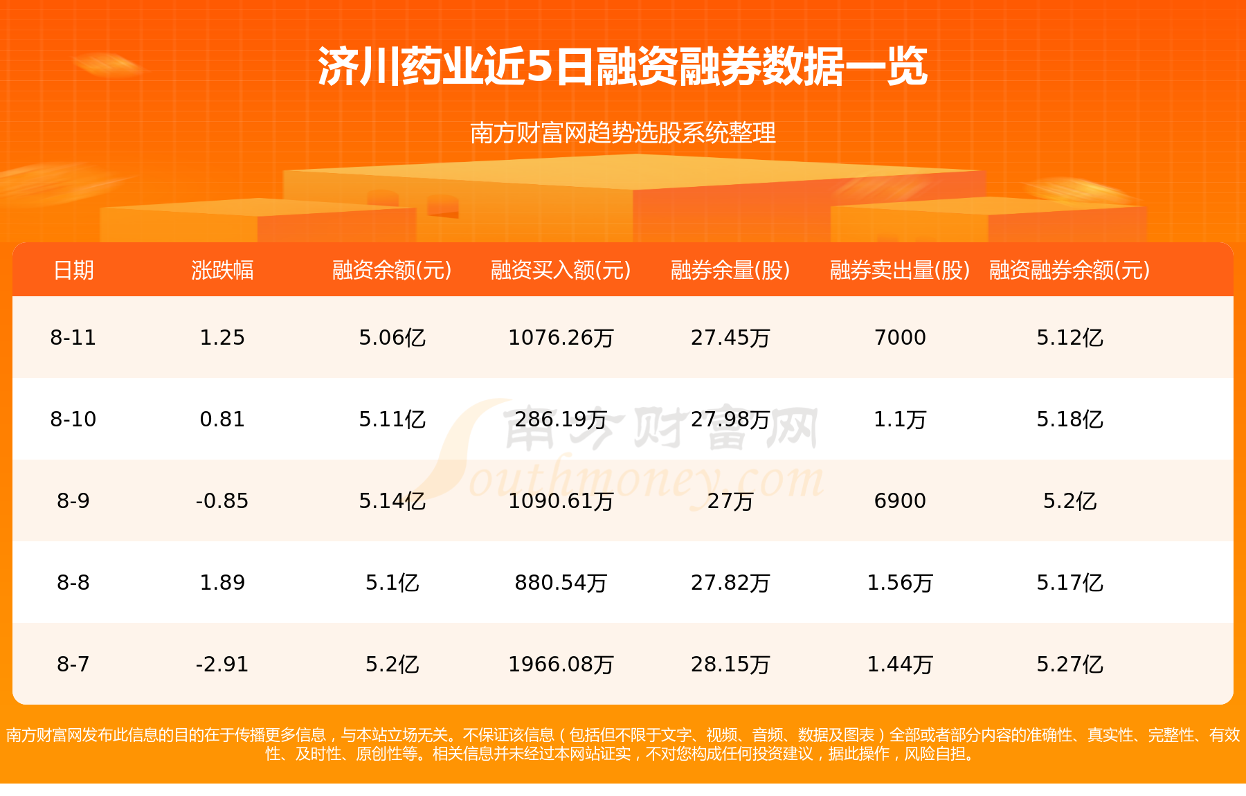 8月11日济川药业融券信息显示,融资方面,当日融资买入1076.26万元,融资偿还1627.44万元,融资净买额-551.19万元。融券方面,融券卖出7000股,融券偿还1.23万股,融券余量27.45万股,融券余额688.51万元。融资融券余额5.12亿元。近5日融资融券数据一览见下表: